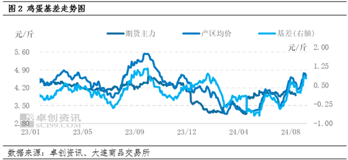 本周鸡蛋期货主力合约2409行情先跌后涨,最低收盘价格为3868元/500千克,最高价格为4038元/500千克。周初期货盘面弱势,期价持续下跌,周二盘面重心跌破3900元/500千克一线。周三盘面开盘短暂下跌后,期价触底反弹,重心回升,期价涨至3950元/500千克以上。截止到本周四合约2409收于4006元/500千克,目前期现货基差在644元/500千克。