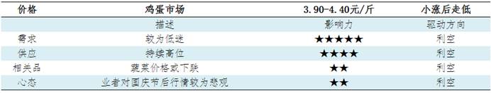 预计10-12月份鸡蛋价格或跌至低位后小幅回升。10月初在国庆假期结束前,下游集中短暂补货,将小幅提振鸡蛋需求,蛋价或触底小幅反弹,但补货结束后,市场缺乏节日提振,市场需求进入季节性淡季,加之鸡蛋供应仍处充足状态,鸡蛋行情或弱势走低,预计月均价为4.10元/斤,月内日均价最低或降至3.90元/斤左右。11月份市场供需宽松格局暂难改变,但低温天气利多鸡蛋存储,养殖单位低价惜售心态增强,经销商轮库出货现象增加,蛋价难有明显下跌,月内蛋价或在3.90-4.20元/斤之间低位震荡盘整,预计月均价为4.00元/斤左右。12月份受到节日支撑,市场需求或有所好转,但供应充足压制下,蛋价上涨幅度有限,预计月均价在4.15元/斤左右。
