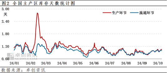 库存:今日全国生产环节平均库存1.06天左右,流通环节库存1.00天左右。市场供需大致平衡。