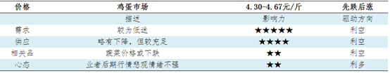 总体上来看,本月产业链供需关系宽松,价格传导相对顺畅。国庆节后市场需求转淡,而供应端充足,供需宽松,鸡蛋价格小幅下滑,淘汰鸡价格小涨,盈利可观,养殖企业大多延长饲养周期,淘汰鸡出栏量有限,支撑淘汰鸡价格上涨。饲料成本下滑,但受蛋价走低影响,养殖利润环比减少。