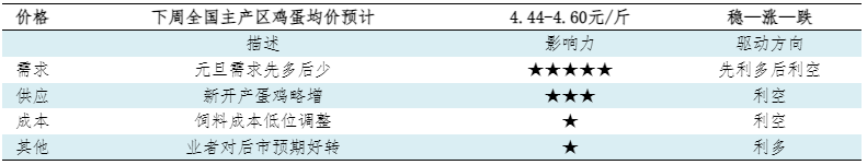 近期全国鸡蛋供应量小幅增多,受元旦影响需求微增,节后需求或减少,卓创资讯预计下周全国鸡蛋价格或呈现先稳后涨趋势,后期微跌。