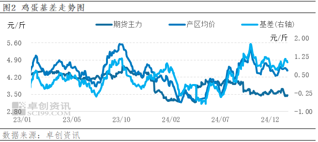 本周鸡蛋期货主力合约2502行情先涨后跌,最低收盘价格为3429元/500千克,最高价格为3458元/500千克。周一和周二期货盘面震荡调整,期价在3440元/500千克一线震荡调整。周三期货盘面拉升,最高涨至3500元/500千克附近,但午盘后重心触顶回落。截止到本周四合约2502收于3449元/500千克,目前期现货基差在991元/500千克。