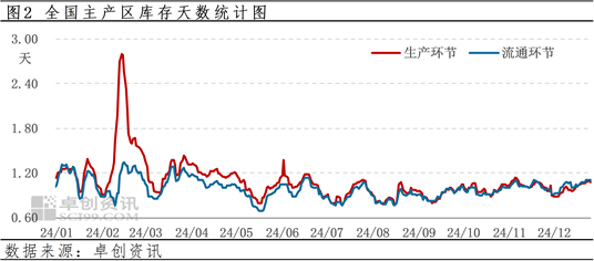 库存:今日生产环节库存均值1.05天,流通环节库存均值1.03天。