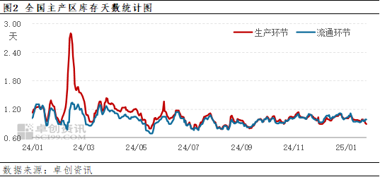 库存:今日全国生产环节平均库存0.89天左右,流通环节库存0.99天左右,各环节积极寻找出货渠道,库存正常。