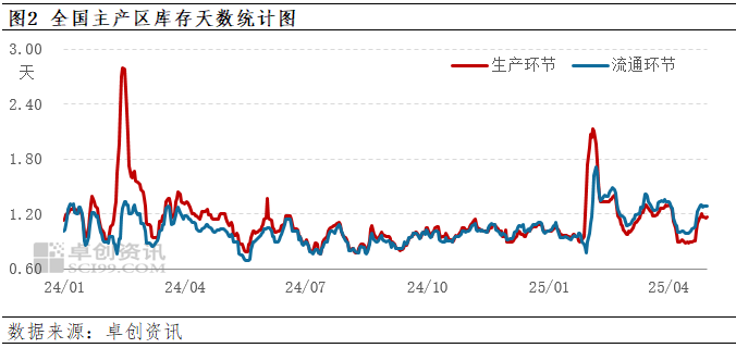 库存:今日全国生产环节平均库存1.17天左右,流通环节库存1.29天左右,有库存压力。