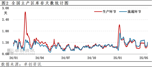库存:今日全国生产环节平均库存1.15天左右,流通环节库存1.21天左右,各环节维持刚需库存,库存水平略增。