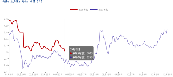 如上图所示,我们简单对比2020和2025年的蛋价走势发现,在高存栏背景下的蛋价表现具有高度一致性,从当前时间节点来看,蛋价仍未到最低点,蛋价或在持续阴跌中在7月份触及低位。