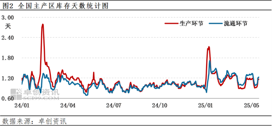 库存:今日全国生产环节平均库存1.17天左右,流通环节库存1.23天左右,各环节维持刚需库存,库存水平略增。
