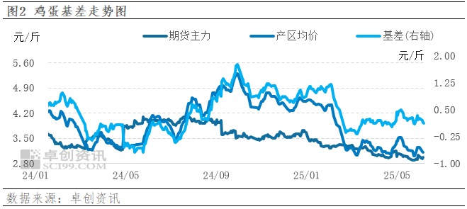 本周鸡蛋期货主力合约2507行情先跌后稳,最低收盘价格为2938元/500千克,最高价格为2964元/500千克。周一期货低开下跌,期价跌至2950元/500千克以下。之后盘面再跌乏力,重心小幅提升,期价在2940-2980元/500千克区间内震荡调整。截止到本周四合约2507收于2957元/500千克,目前期现货基差在83元/500千克。