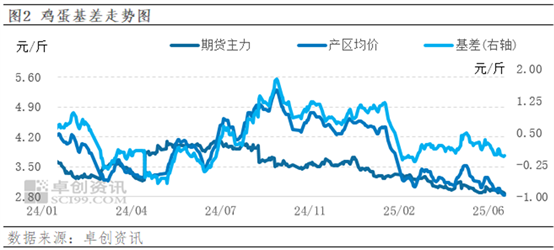 本周鸡蛋期货主力合约2507行情下跌,最低收盘价格为2877元/500千克,最高价格为2897元/500千克。周二期货开盘下跌,特别是午盘后期价跌破2900元/500千克支撑。之后盘面再跌乏力,期价底部支撑渐显,重心在2870-2900元/500千克区间内调整。截止到本周四合约2507收于2878元/500千克,目前期现货基差在-38元/500千克。