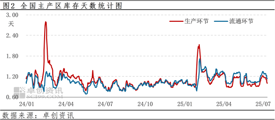 库存:今日全国生产环节平均库存1.00天左右,流通环节库存1.14天左右,各环节维持刚需库存,局部余货逐步减少。