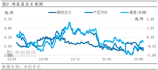 本周鸡蛋期货主力合约2510行情上涨,最低收盘价格为2921元/500千克,最高价格为3021元/500千克。周一期货开盘小幅上涨后回落,特别是尾盘期价跌至2920元/500千克附近。周二开始盘面转强,期价持续上涨,重心涨至3000元/500千克附近。之后再涨动力不足,期价在3000元/500千克一线震荡调整。截止到本周四合约2510收于3021元/500千克,目前期现货基差在199元/500千克。