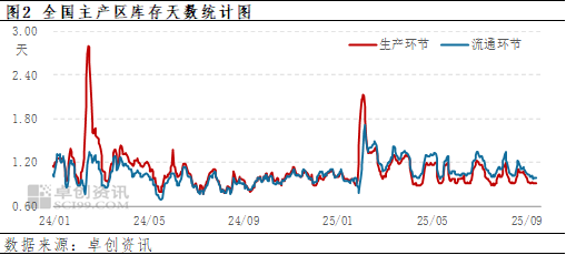 库存:今日全国生产环节平均库存0.91天左右,流通环节库存0.99天左右,各环节顺势购销,库存变化不大。