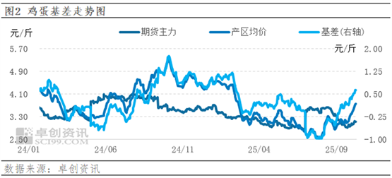 鸡蛋期货行情先涨后跌。本周鸡蛋期货主力合约2511行情先涨后跌,最低收盘价格为3113元/500千克,最高价格为3143元/500千克。周一期货开盘高开后直线拉升,期价最高涨至3200元/500千克附近。午盘后重心回落,期价跌至3150元/500千克附近。周二盘面继续回落,期价跌至3110元/500千克附近。之后盘面涨跌两难,期价在3100-3130元/500千克区间内调整。截止到本周四合约2511收于3132元/500千克,目前期现货基差在578元/500千克。
