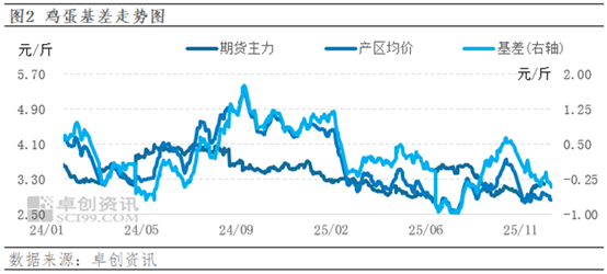 本周鸡蛋期货主力由合约2512转移至合约2601,行情先跌后涨,最低收盘价格为3180元/500千克,最高价格为3238元/500千克。周一期货低开后小幅下跌,但底部支撑渐显,午盘后重心小幅回升。周二盘面再度转弱,期价继续下跌,重心最低跌至3160元/500千克附近。周三之后盘面触底反弹,期价重回3200元/500千克一线以上。截止到本周四合约2601收于3238元/500千克,目前期现货基差在-418元/500千克。