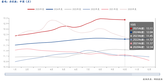 上图可看,据Mysteel统计, 10月全国在产蛋鸡存栏量仍在13.11亿只左右,在产蛋鸡存栏量依旧处在近五年均值高位。从供应面看,11月份新开产蛋鸡多为7月份前后补栏鸡苗,据 Mysteel 鸡苗数据统计显示,7月份补栏环比6月份降幅较大,新开产数量较少,从目前大小码价格也可反映;另一方面屠宰开工率维持较高水平,但屠宰终端走货一般,始终不能满开加速产能去化,但目前从整体淘汰情况来看,淘汰量要高于补栏量,全国蛋鸡总存栏处于缓慢下降趋势,短期来看,淘鸡价格上涨空间不大,随着淘鸡数量的增加以及后市新开产减少,总存栏预计继续下降。