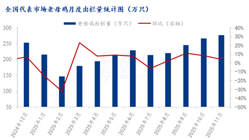 Mysteel农产品对全国10个重点产区19个代表市场的老母鸡出栏量进行监测统计,11月正处市场需求淡季,蛋价持续低位震荡,多数养户对后市信心减弱淘汰情绪升温,致使老母鸡均价跌破“4元”关口,部分养户亦从低价惜售心态转至逐步接受。需求面下游农贸市场活禽及冻品销量不佳,屠宰企业维持刚需库存。整体看来,11月老母鸡出栏量环比增加。