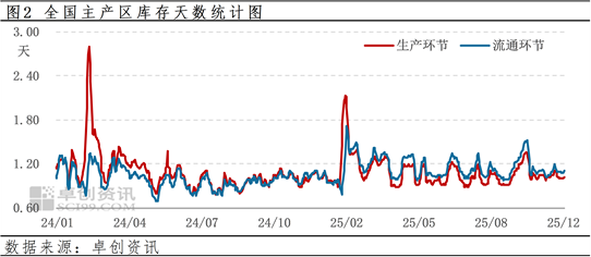 库存:今日全国生产环节平均库存1.02天左右,流通环节库存1.10天左右,各环节维持刚需库存。