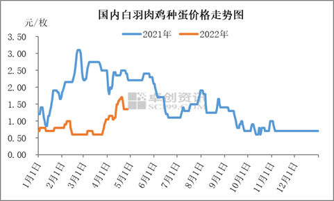 截至27日,4月白羽肉鸡种蛋均价1.33元/枚,较上月均价增加0.65元/枚,较去年4月均价下降0.97元/枚。4月中上旬鸡苗价格大幅上行,孵化企业采购积极性提高,种蛋价格大幅上行。下旬鸡苗价格高位回落,厂家采购种蛋心态欠佳,需求面利空市场,种蛋价格下滑。