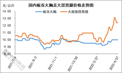 截至27日,4月白羽肉鸡产品价格较上月均价走高。板冻大胸均价9.88元/公斤,较上月均价上涨0.53元/公斤,较去年4月均价走低0.42元/公斤;大规格琵琶腿均价12.11元/公斤,较上月均价走高1.86元/公斤,较去年4月均价上涨1.57元/公斤。月内毛鸡价格整体上行,胸类、琵琶腿类产品需求转强,经销商补货积极性提升,厂家出货节奏加快,产品价格整体上涨。