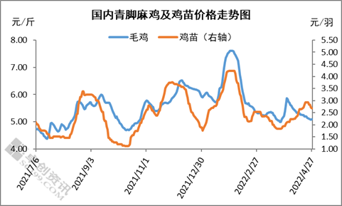 青脚麻鸡:5月份毛鸡整体出栏量不多,五一假期对市场几无提振,加之交通运输阻力加大,经销商订货积极性降低,需求面对市场有较强利空影响,毛鸡走货速度不快,毛鸡价格或持续低位。卓创资讯预计5月青脚麻鸡均价5.15元/斤。