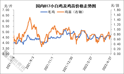 817小白鸡:根据卓创资讯监测的样本企业出苗量数据推算,5月上旬817毛鸡出栏量继续减少,终端市场需求小幅提升,卓创资讯预计5月上旬鸡价上行。5月中下旬市场需求不足,毛鸡供应量或逐渐增加,鸡价或高位回落。卓创资讯预计5月份817小白鸡均价为4.63元/斤。