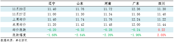 预计未来一周全国行情或呈跌后小涨再跌的态势,价格运行区间或在11.12-11.30元/公斤。