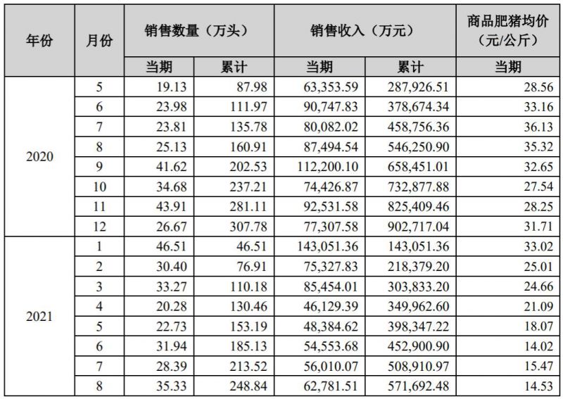 2021 年 1-8 月销售商品猪 248.84 万头(其中仔猪销售 48.00 万头),销售收入571,692.48 万元,销售均价 21.53 元/公斤(商品肥猪均价为 20.19 元/公斤),同比变动分别为 54.65%、4.66%、-62.44%。