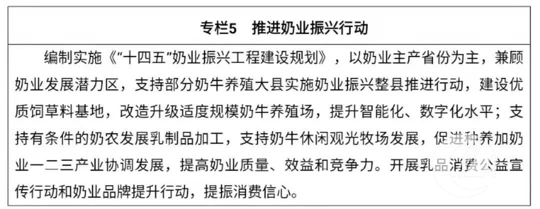 发展目标。奶源自给率达到70%以上,奶类产量稳定在3600万吨左右,存栏100头以上奶牛规模养殖比重超过70%,乳品质量安全水平不断提高,奶业养殖业产值达到1500亿元,实现奶业全面振兴。